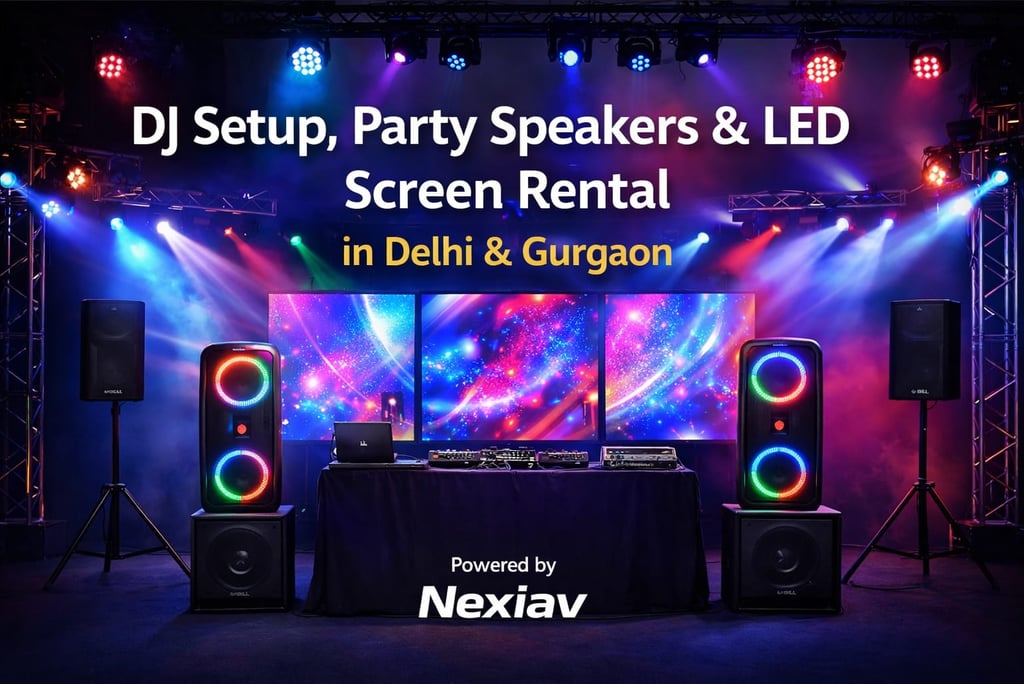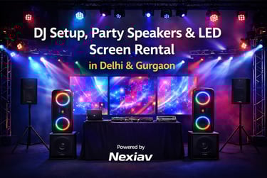 Nexiav provides professional DJ setup, high-power party speakers, and advanced LED screen rental services across Delhi and Gurgaon. From house parties to large-scale weddings and corporate events, we deliver complete sound, lighting, and visual solutions with expert setup and on-site support.